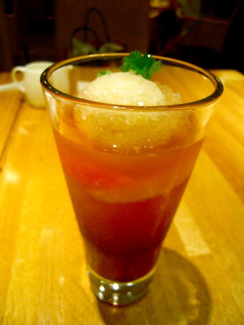 冷たい紅茶とグレープフルーツジュースとグレープフルーツの果肉とグレープフルーツのソルベ。
