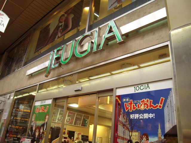 ここJEUGIA(ジュージヤ)三条本店は、京都アニメーション制作の「けいおん!」の大ヒットでファンの聖地になっているらしいですね。