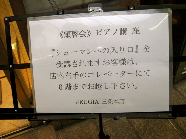 外出の目的は、「JEUGIA(ジュージヤ)三条本店」で行われる「シューマンへの入り口」というお話を聞くためです。ちょうど今シューマンの「ウィーンの謝肉祭の道化」を選んで練習しているので、ピアノの師でもある友人が誘ってくれたのです。