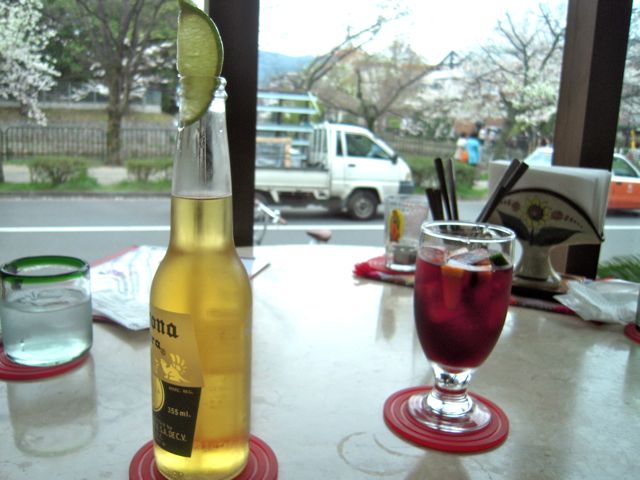 目の前には今歩いてきた疎水の景色が広がります。桜と十石舟を眺めながら、サングリアとコロナビールで乾杯。お昼のビールは特にクーッと咽喉にしみますね。花見気分が盛り上がります。