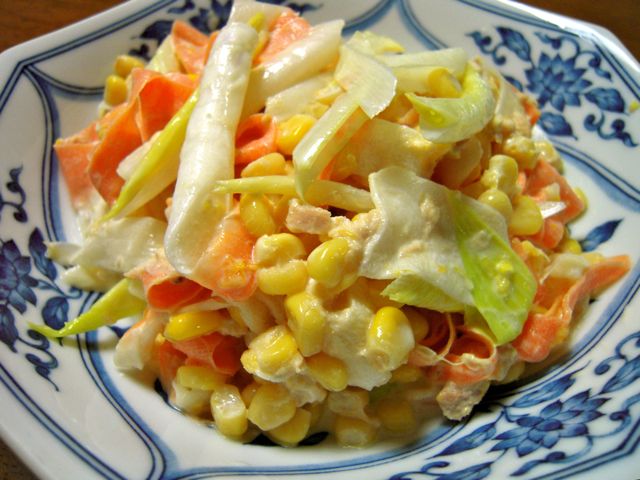 お味噌でも食べてみたいので、このときは半分使い、ニンジンをピーラーでうすくしたものとコーンも一緒にツナサラダにしました。