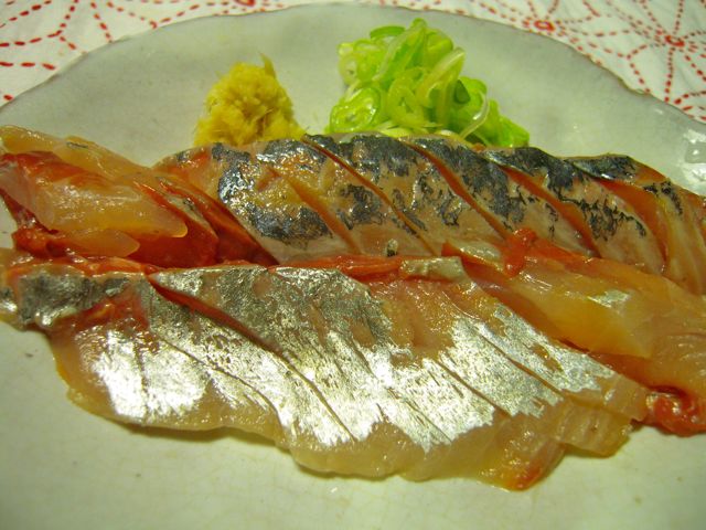 お造り用のアジは骨を取り除き、皮を剥いで、おろし生姜と刻みネギで。