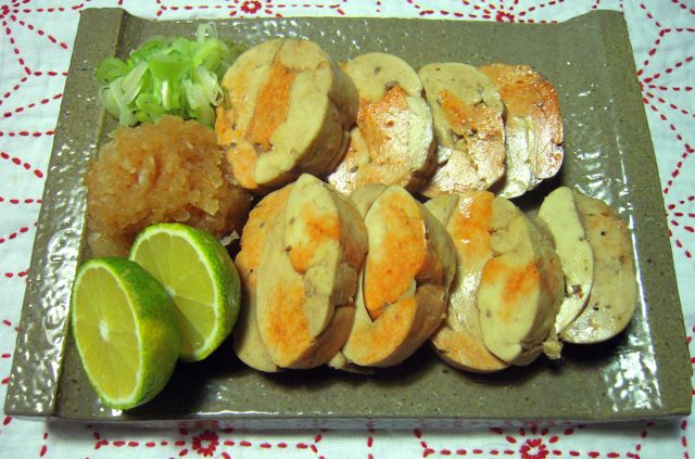 ラップで巻いたらしっかりと両端をねじってとめて、20分蒸しました。冷まして輪切り。
