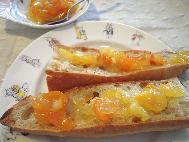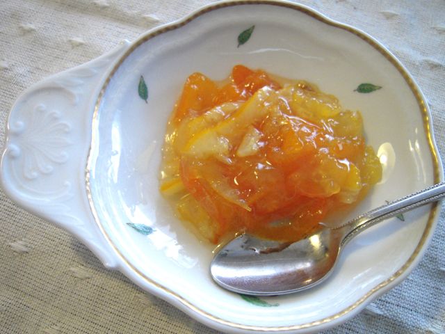 甘くてそのまま生で食べられる金柑が数粒残っていたのと、近郊農家の甘いレモンがひとつあったので、薄く刻んで一緒に煮て、マーマレードにしました。