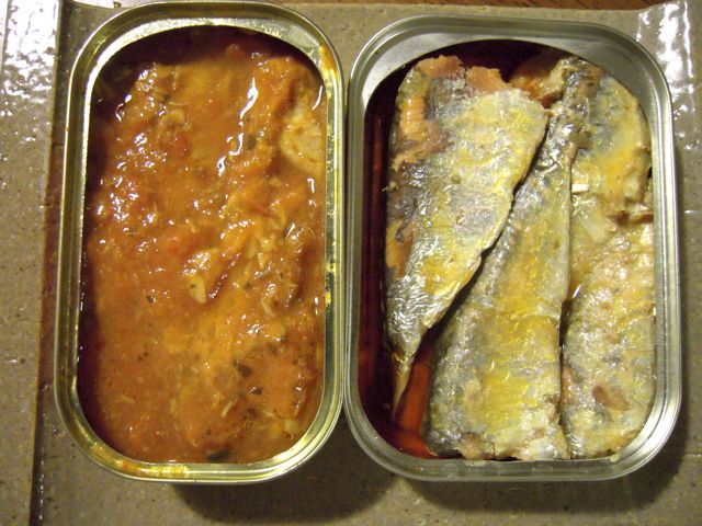 フランスからのサバ缶とサーディン缶を、3種の豆(高原豆、ひよこ豆、レンズ豆)のトマト煮込みとともに食べた夕食のその他のメニュー。