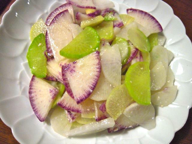 その3種類を薄切りにして塩麹でもみ、浅漬け風のサラダにしました。