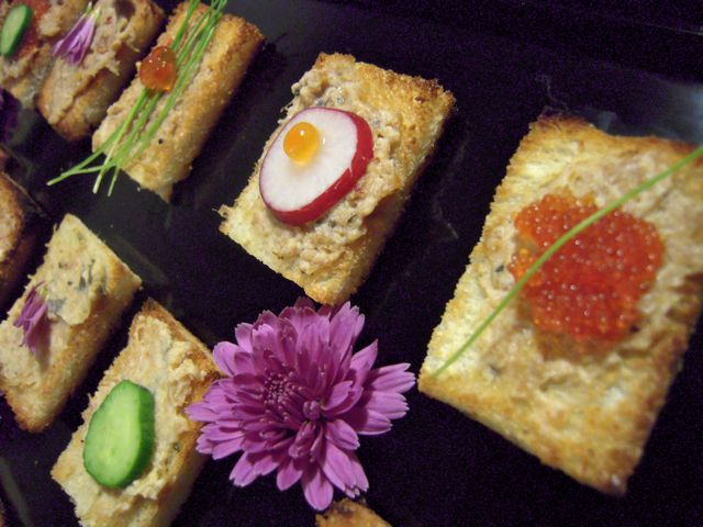 サンドイッチ用のパンを耳を落として小さな四角に切り、軽くトーストして4種類のパテを塗りました