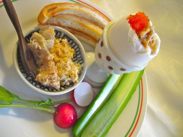 半熟卵の上にのせて、カリッと焼いたトーストに、半熟の黄身とパテを絡ませながら食べる。