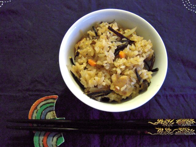 ひじきおこわを作るために、「はて、ひじきは戻して味付けしとくのだったかしら?それなら今からだと面倒だなあ。」とか、「ほかに入れる具はなににしようかしら?」とか。