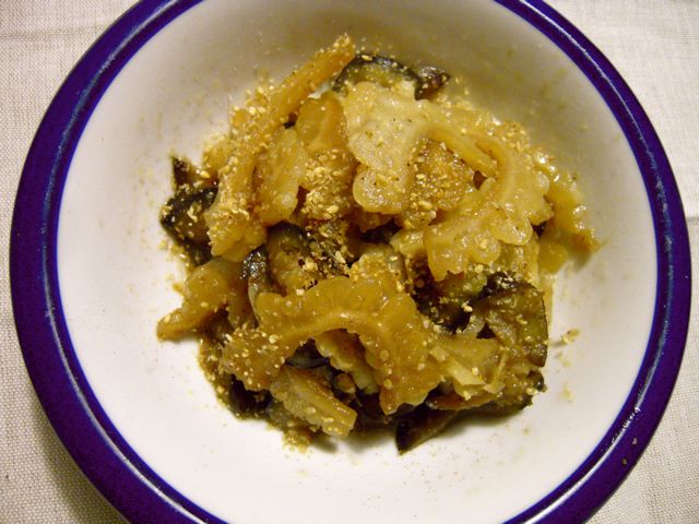 太白胡麻油で白ゴーヤとナスの薄切りを炒め、砂糖と醤油で甘辛く味付け。