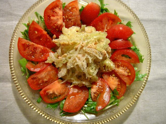 周りには、水菜のサラダをぐるりと置いて、その上に彩りのトマト。