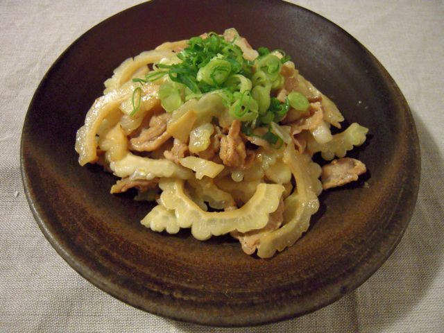 コックリさせようとオリーブ油を使いました。油が冷たいうちにショウガとニンニクの薄切りを入れて香りを出し、豚肉を入れてサッといためたところへ白ゴーヤの薄切り(歯ごたえを残すためにあまり薄くなく)を併せて炒め、塩少々、みりん、オイスターソース、胡椒で味付け。