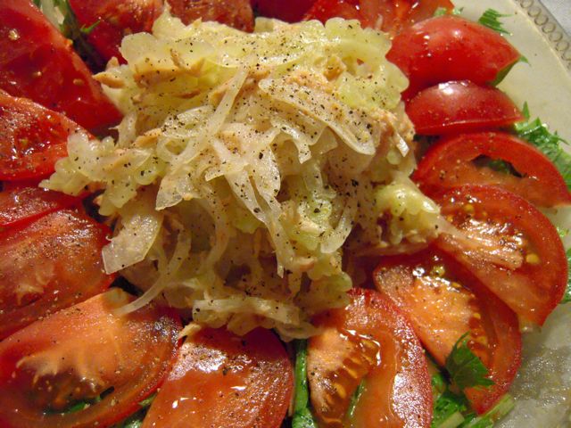 白ゴーヤとタマネギの水気をとったら、ツナと合えて、酢(わたしは自作のフルーツ酢で甘味も一緒に)、出汁醤油で味付け。