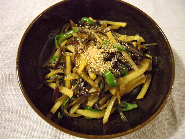 剥いたナスの皮は細く刻んで、ピーマン、じゃがいもを細くきざんだものと一緒にきんぴらにしました。