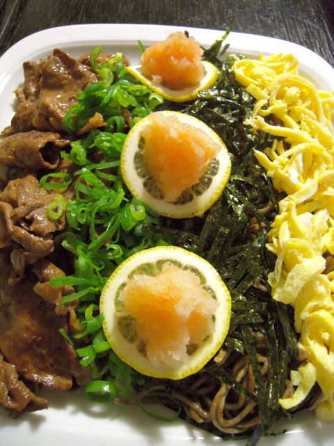 甘辛く味付けた牛肉、錦糸タマゴ、ネギ、のり、もみじおろし、レモンの醸し出すハーモニー。そばは焼き付けてまわりはカリカリ。少し甘めのつゆに浸して食べます。