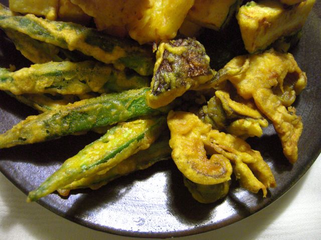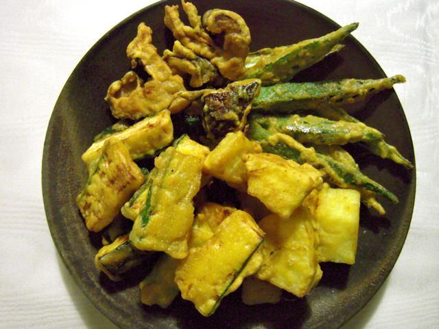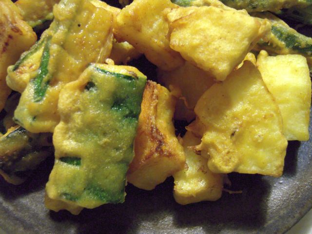 そうめんカボチャ、オクラ、ズッキーニ、それに贅沢にもマツタケを、インド風てんぷらのパコラに。