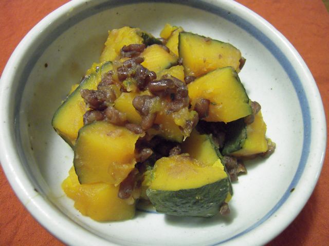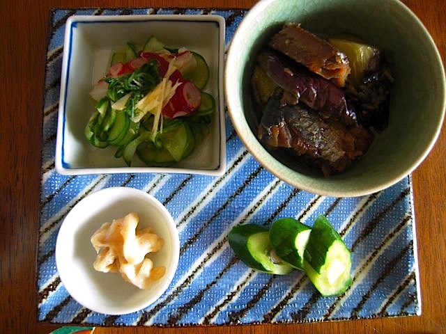 左上から時計回りに、キュウリとタコの酢の物、にしんなす、キュウリの鉄砲漬け(伊勢丹で買ってきた野呂漬物のお漬物。キュウリの中に山牛蒡と青じそが入ってます。)、クラゲのかす漬け(佐賀県の名産らしい)。