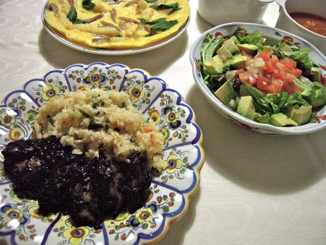 タマネギとエノキと少しのトマトとモロヘイヤ入りのリゾットと合わせてみることにしました。