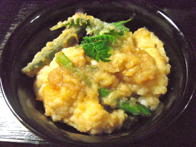 わたしの作ったのは、ハモのてんぷらの他、アスパラガス、空豆、レンコン、ししとう、大葉、ナス、オクラなどの野菜も一緒です。