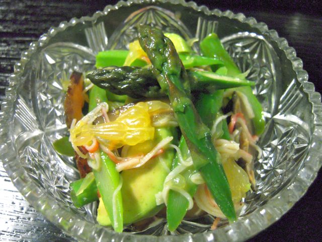 もう一品は、アスパラガス、アボカド、しいたけ、かにかま、夏みかんをあわせた酢の物です。