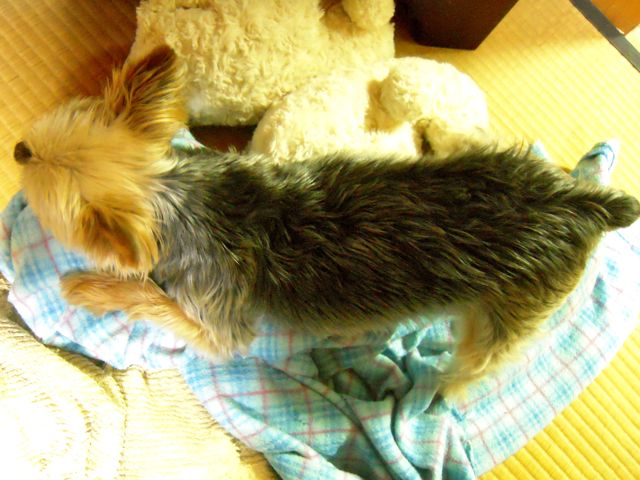 クッキーちゃんは、お気に入りの毛布をシガシガ噛んでお尻をフリフリ。クッキー、またね。
