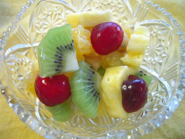 フルーツサラダ(パイナップル、キウイ、バナナ、夏みかん、アメリカンチェリー。友人宅では途中のサーティーワンで買ったグレープソルベ、レモンシャーベットを乗せて食べました。)