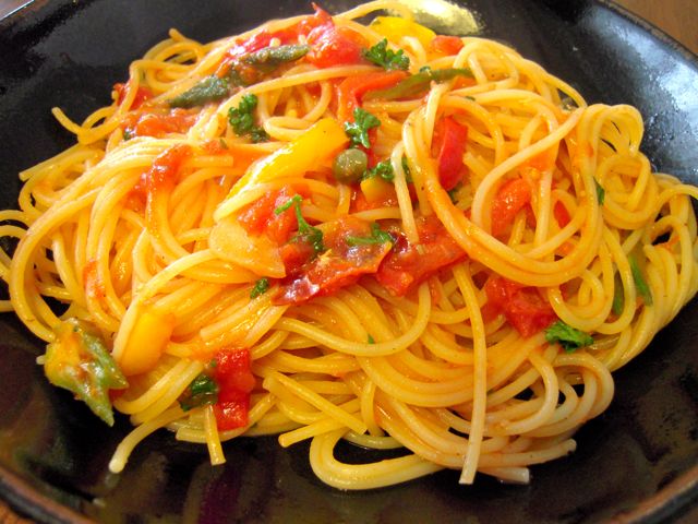 スパゲティは、冷製にするときには袋の表示の分数より少しだけ長く茹で、氷水で締めます。