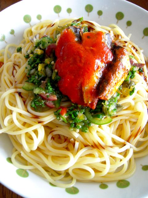 スパゲティをお皿に盛り、がスパチョ風ソースを上に乗せ、その上にトマトのサーディンを置き、完成です。