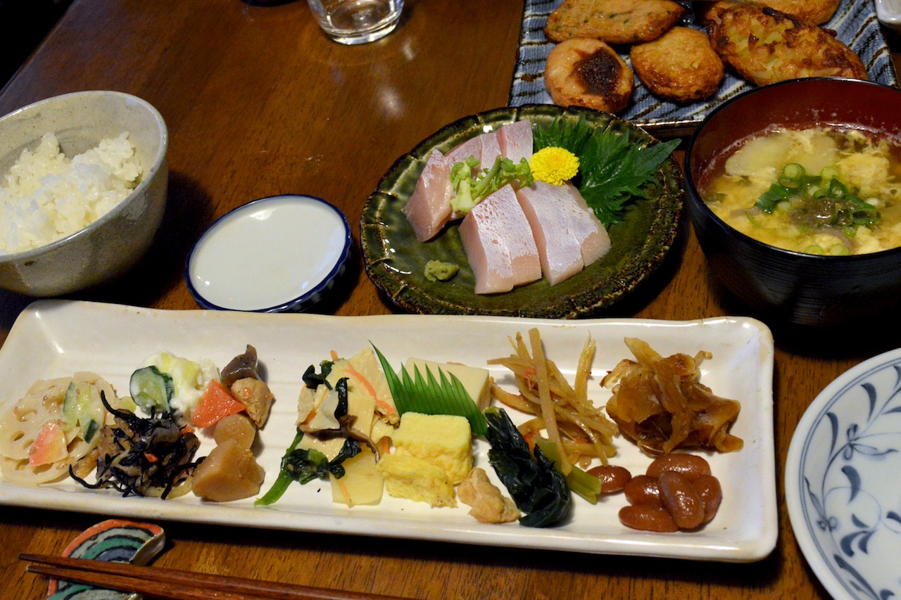 具だくさんのお味噌汁を用意して、お惣菜は一人ずつの長細いおさらにちょびっとずつ盛りつけ、ブリのお刺身を切って、さつま揚げはオーブントースターで香ばしく温めて。(昨日食べすぎたのでご飯は小盛り)