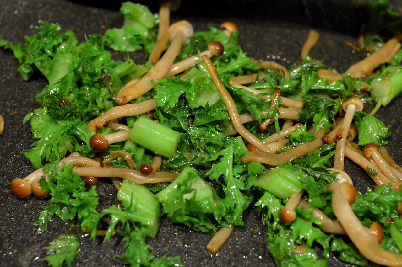 冷蔵庫に今はニラがなかったので、ワサビ菜を刻んだものとかきの木茸をバターで炒めることにしました。