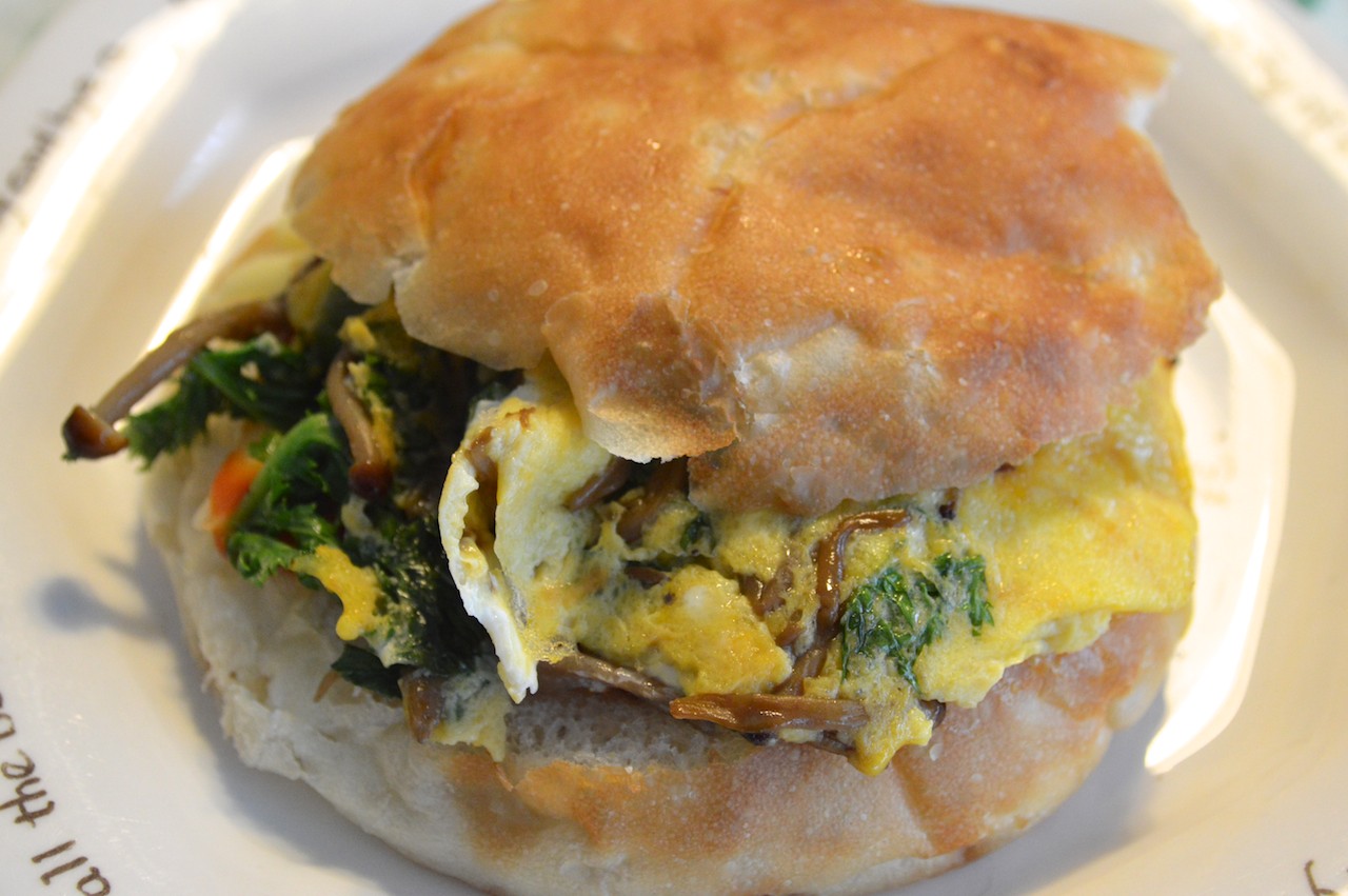 玄米バンズにはさむのはオムレツ。