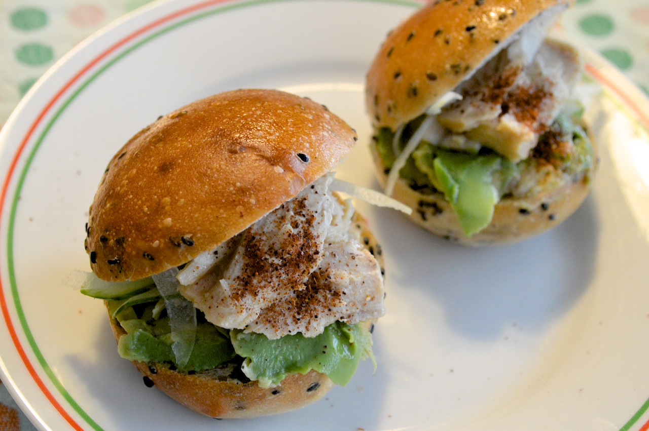 真ん中に切れ目を入れて、マヨネーズを塗り、柔らかくなっていたアボカドをスプーンですくって塗りつけ、キュウリとタマネギの薄切りをのせ、そこに缶詰のマグロをはさみました。アクセントにチリパウダーを振りました。