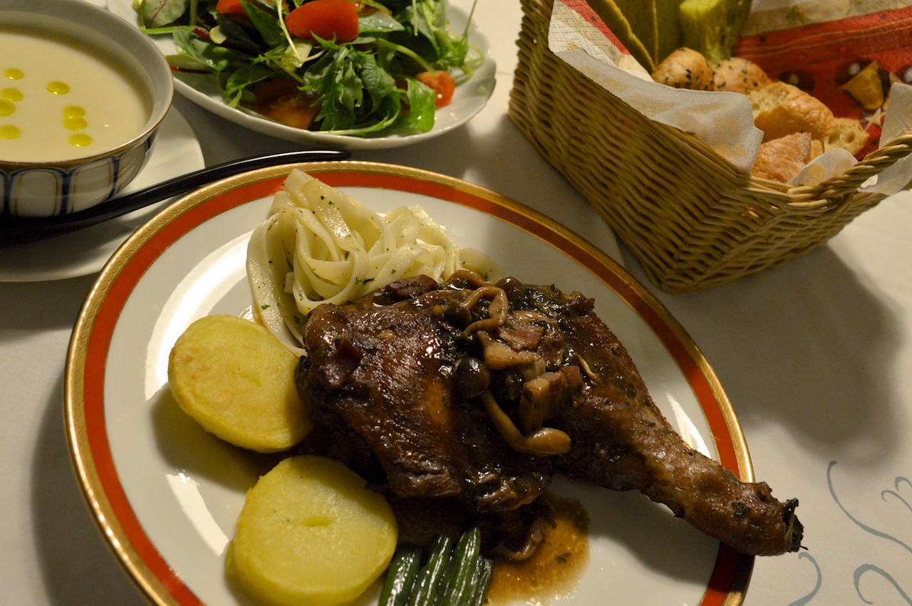 隠し味に酒粕を少しつかった蕪のポタージュでスッキリとなった口の中に、濃厚な鶏の味が広がりました。