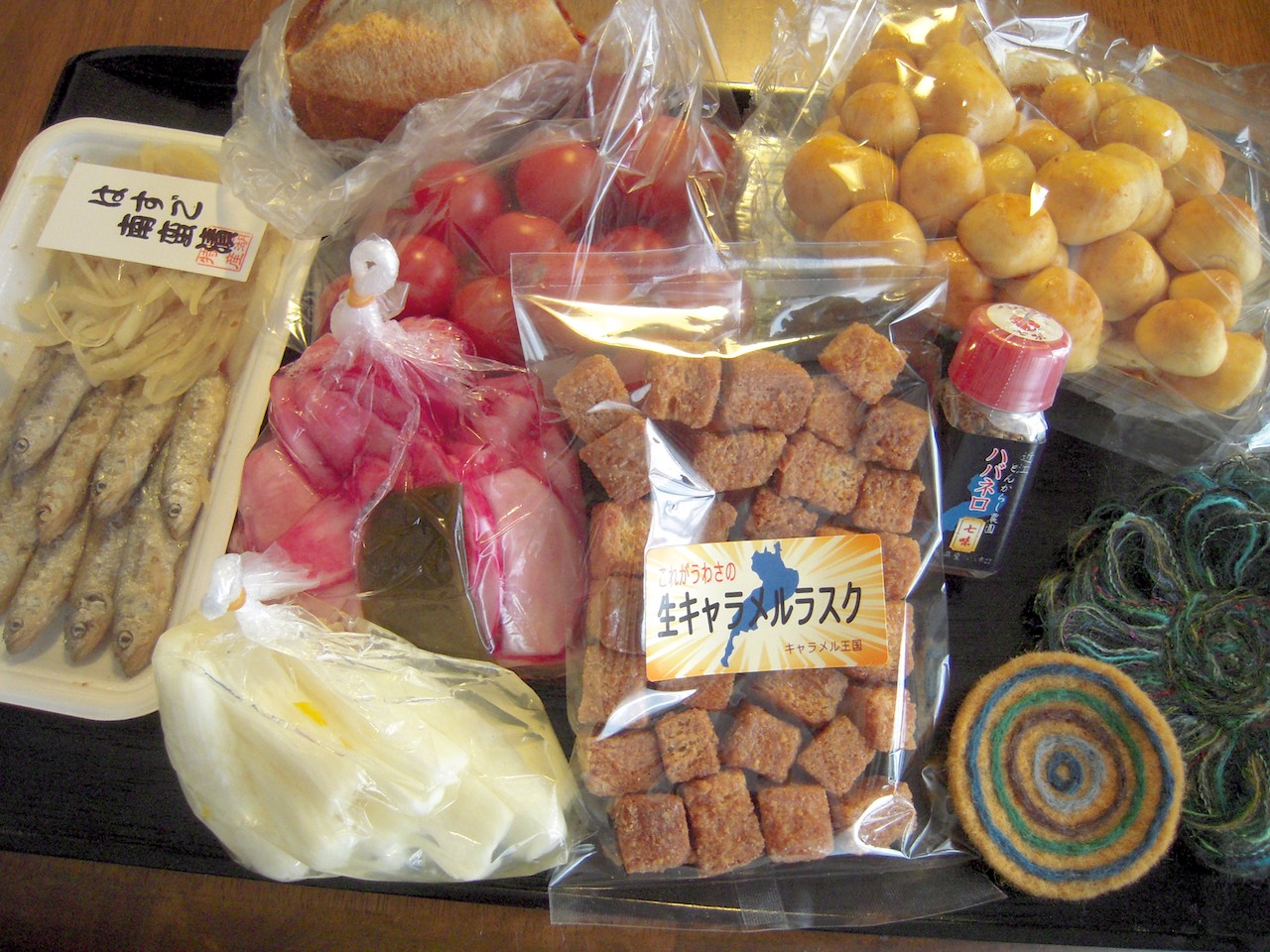 あとはおつけもの、琵琶湖のハスゴの南蛮漬け、毛糸とフェルトのブローチ、チェリッシュのパン。