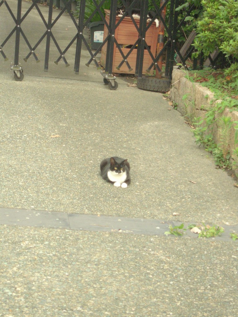 蒸気機関車館のある旧二条駅舎近くで、夕涼みに出てきてる白黒の猫にも会いました。