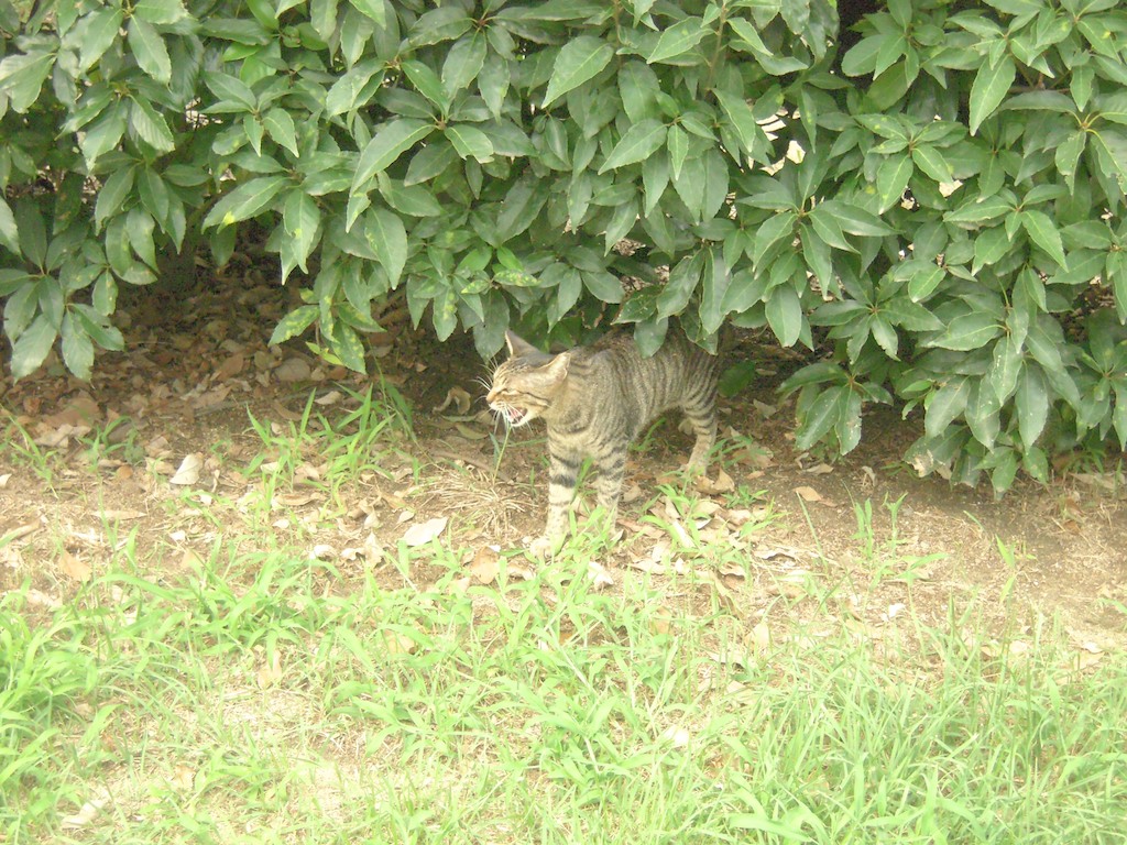 芙蓉の木を見に行ってみたら、その手前の木陰から1匹のきじ猫が出て来ました。