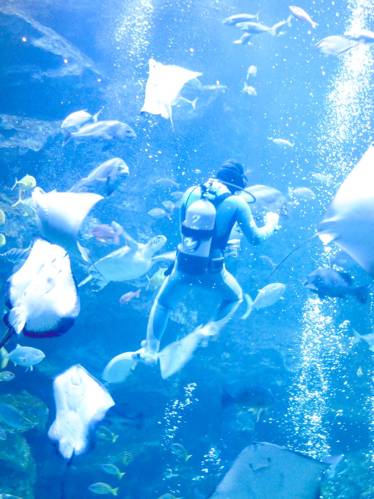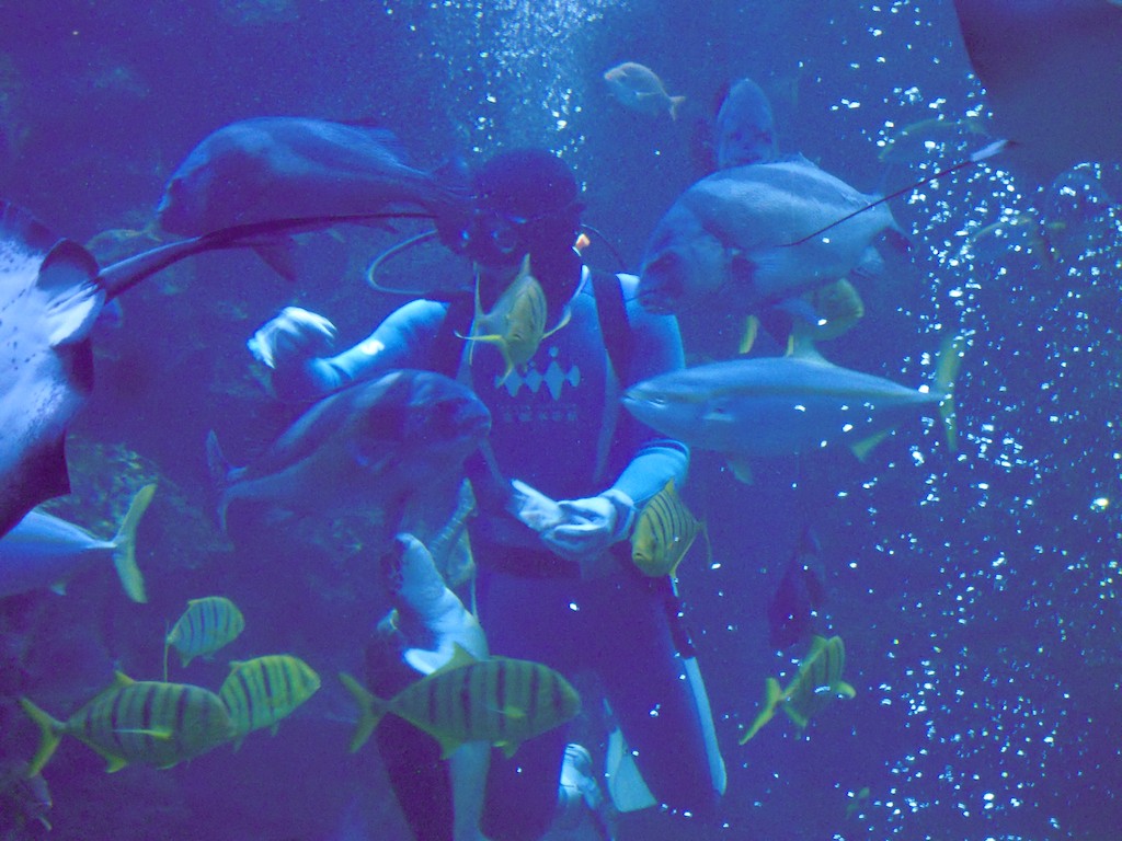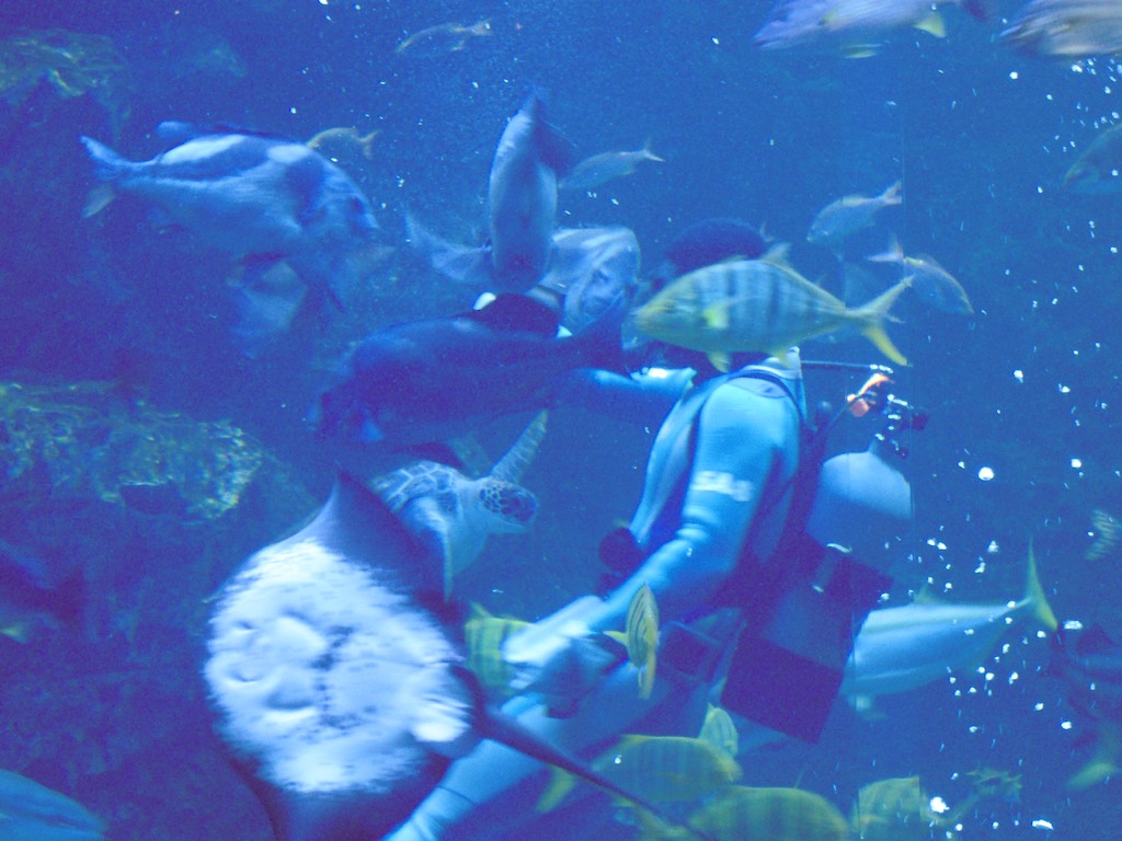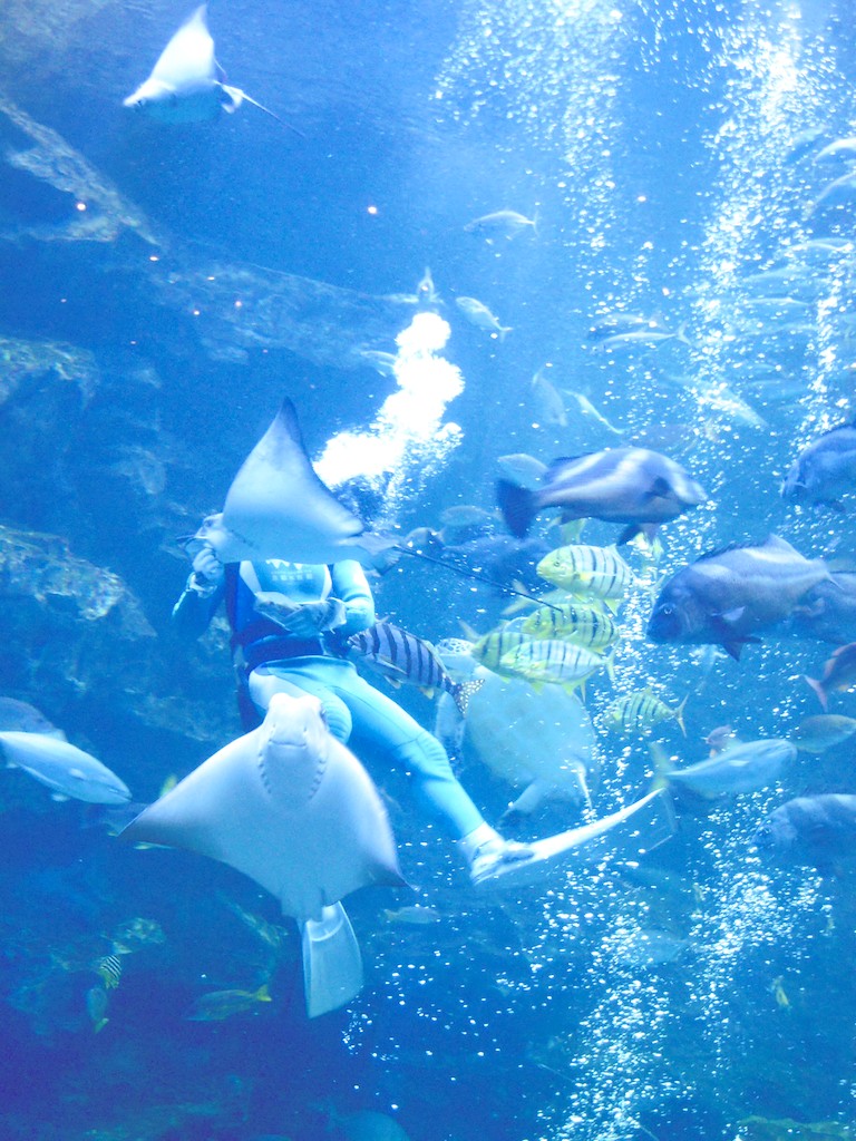 大水槽のダイビングスーツでのスタッフの餌やり。今日行ったら、それをパフォーマンスとしてうまく利用されていました。
