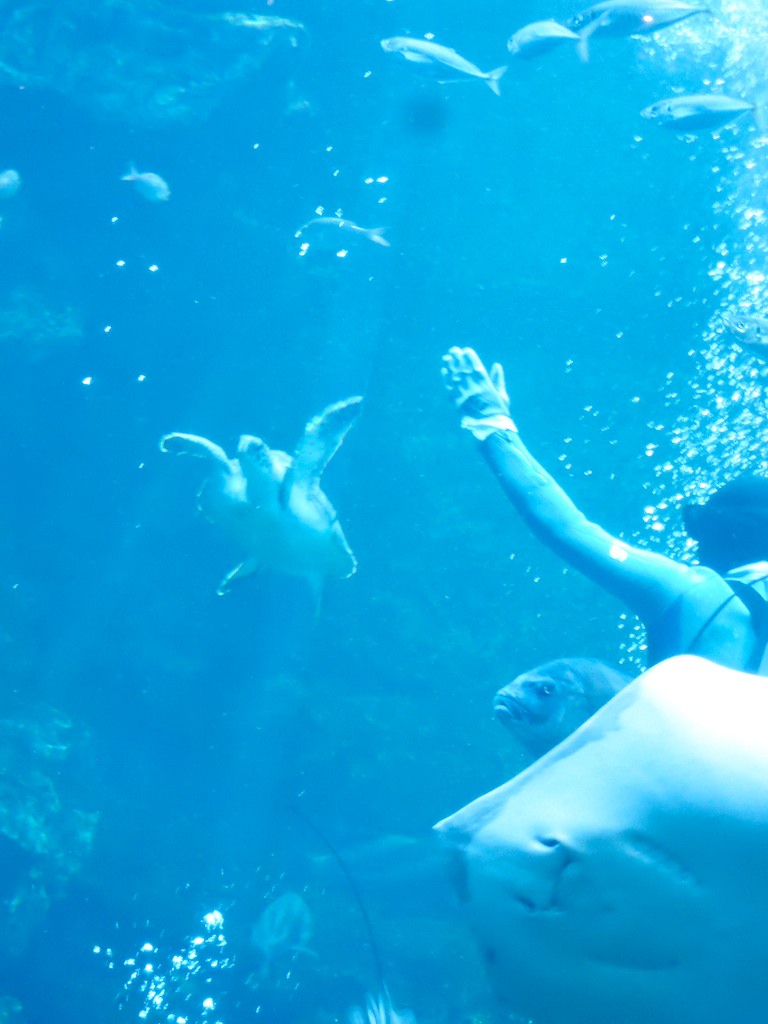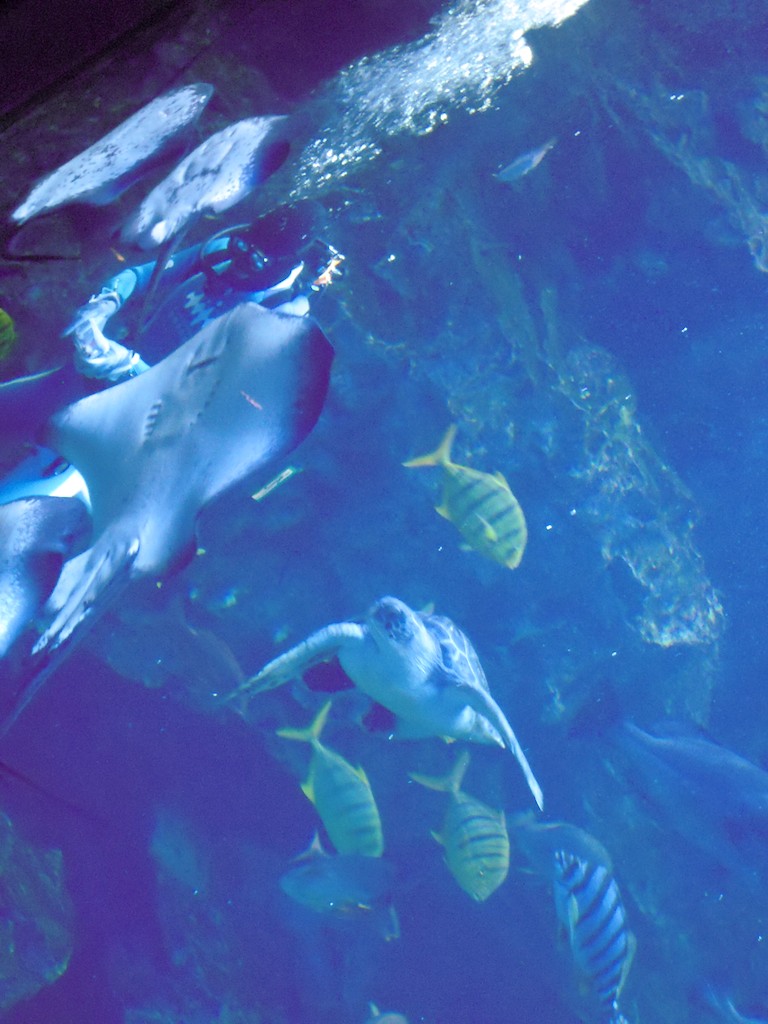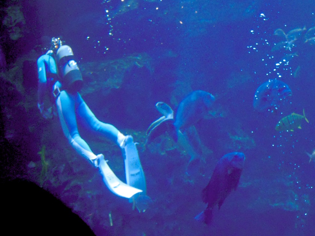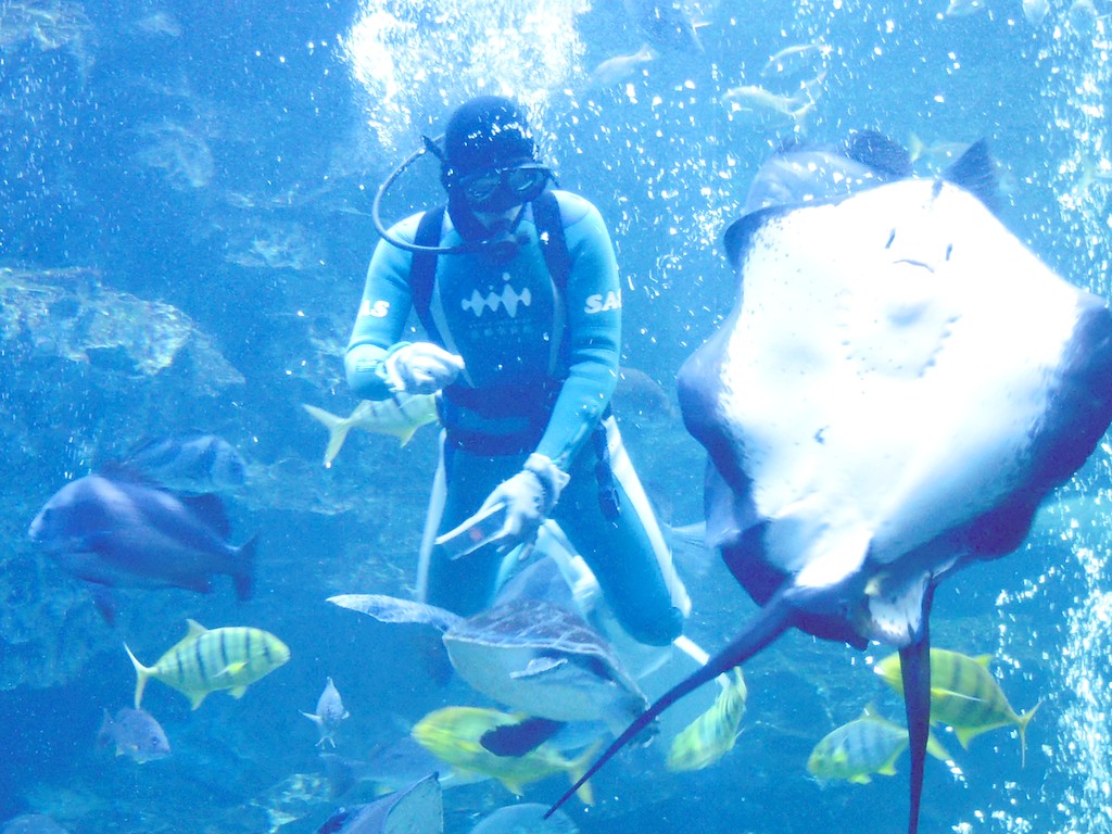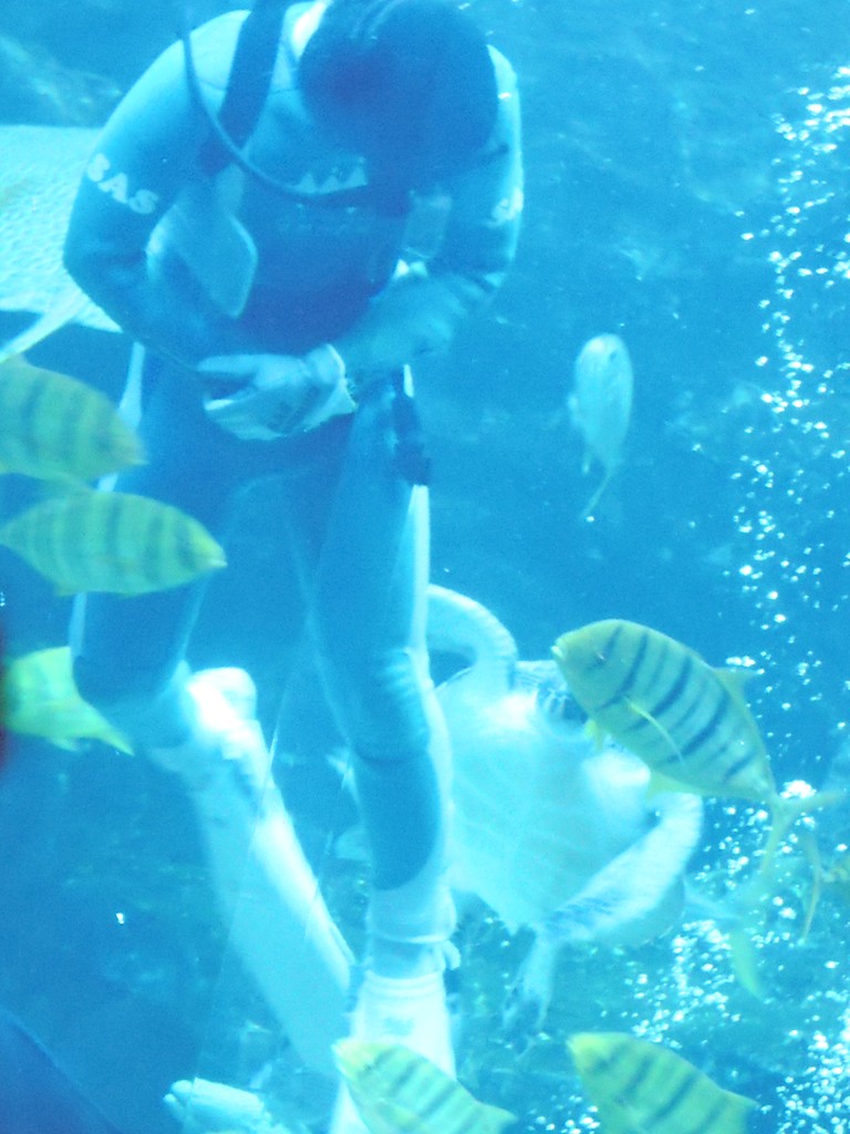 大水槽のダイビングスーツでのスタッフの餌やり。今日行ったら、それをパフォーマンスとしてうまく利用されていました。