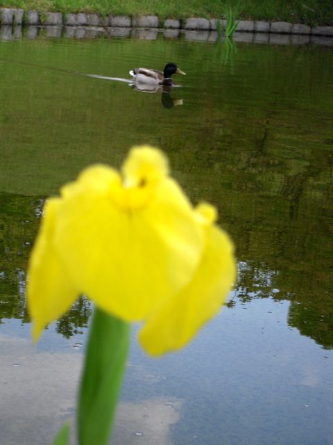 黄色いカキツバタをワンショットにおさめーのー。とか、工夫する間がないほど、カモの泳ぎはそれほど速いのですよ。