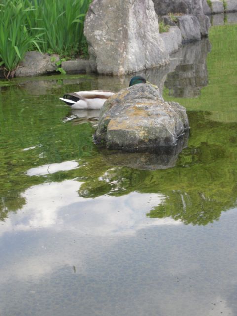 朱雀の庭の池にカモを見つけました。カモは交雑種が多いので正確なところはよくわかりませんが、一見したところマガモのよう。