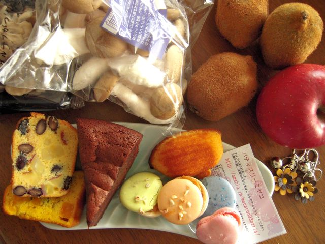 信州からの果物やきのこ、豆や穀類のお店『アイダナ』で、いつも買う大シメジとマイタケ、キウイとリンゴ。
