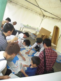京都市交通局のお宝コーナーにもたくさんの同好の士がつめかけています。このときは京都市バスの時刻表が売られていました。