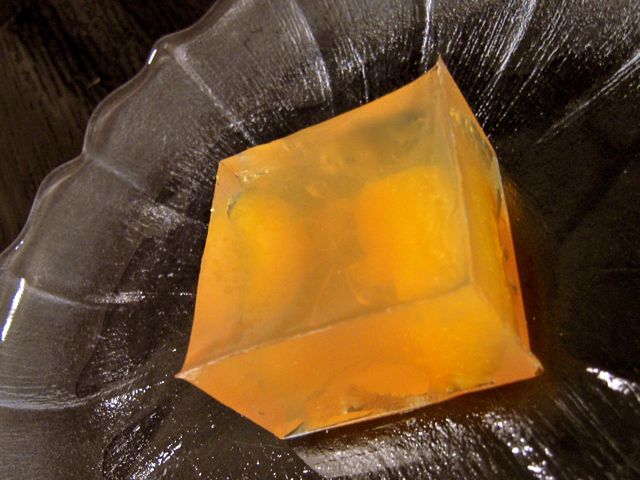 出来上がりは、みかんの寒天は透明でほの紅く、みかんがキラキラ見え、