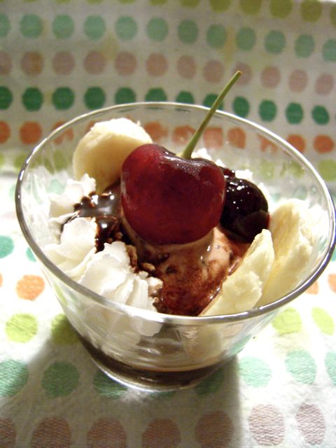今日は、コーヒーゼリーの上にチョコレートアイス、ホイップクリーム、バナナ、アメリカンチェリーのジャム、生アメリカンチェリーを乗せて、コーヒーゼリーパフェ。