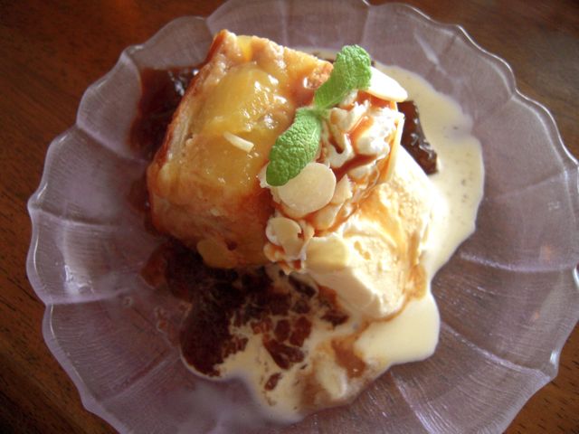 最近よく作っているコーヒーゼリーをくずしてお皿に敷き、その上にケーキ、横にバニラアイス、ホイップクリームで飾り、キャラメルソースとスライスアーモンドのトッピング、ミントの葉をアクセントにしてみました。