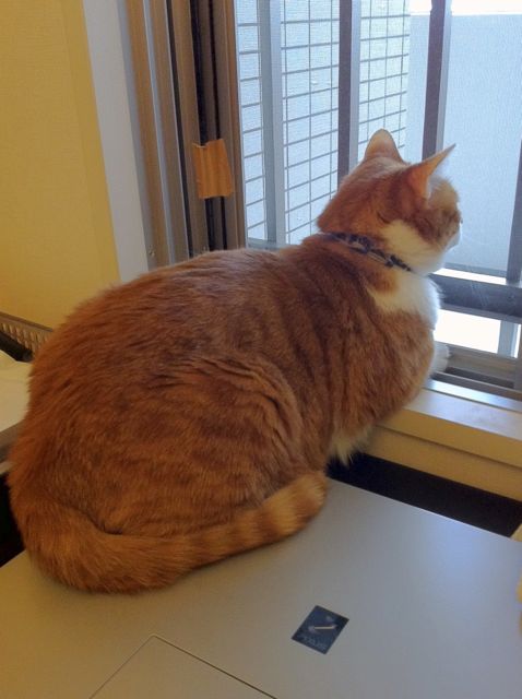 プリンターの上に座って外を眺める(チェックする)ウィスキーさん。