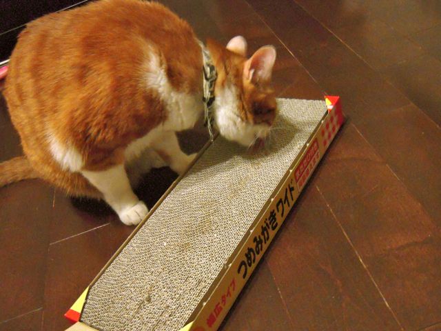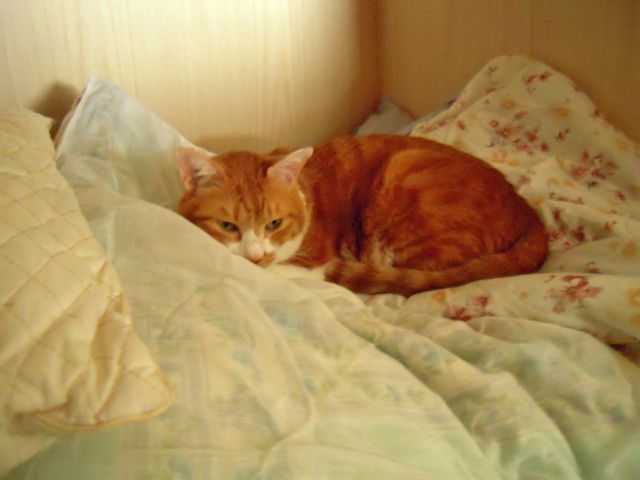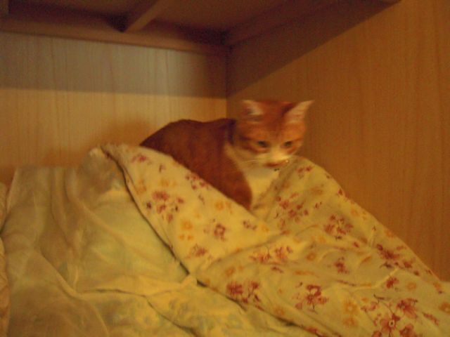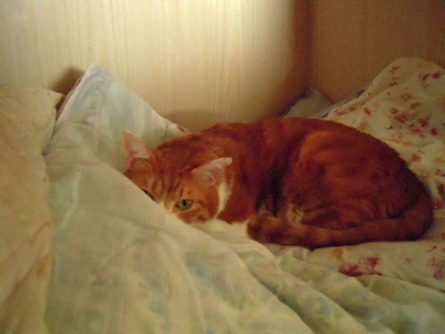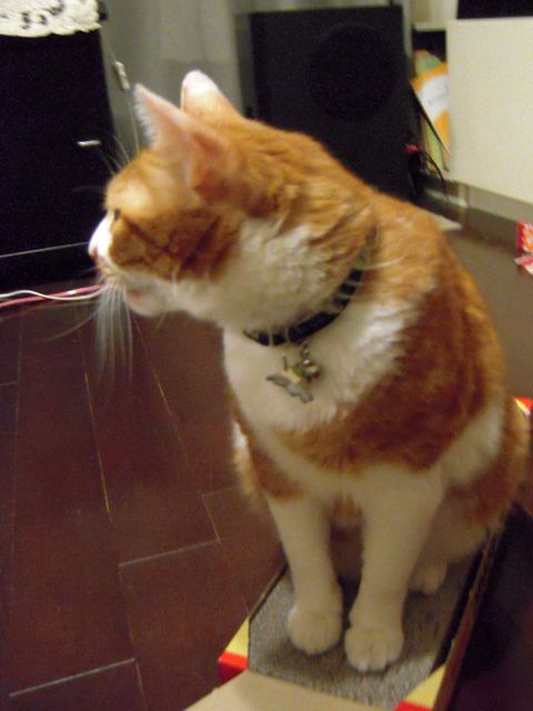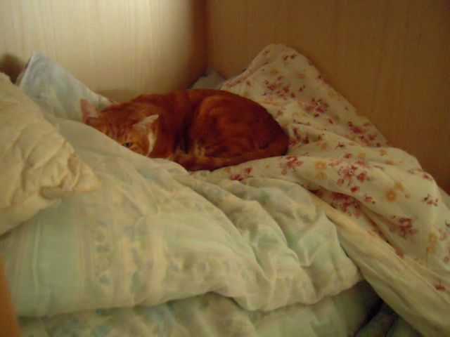 ついこのあいだまではもうひとつ上の段の、物がしまってある段ボール箱の上がお気に入りの場所でした。