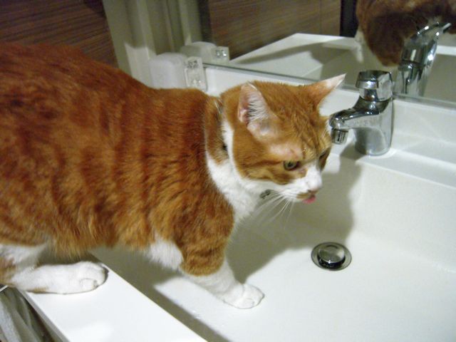 友人宅のお嬢猫さまはトイレタンク上部の手洗い水がお好きだということですが、うちのウィスキーは洗面所の水が好き。