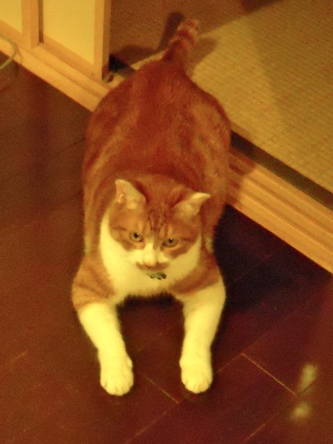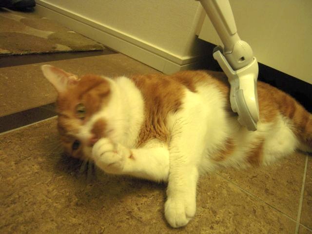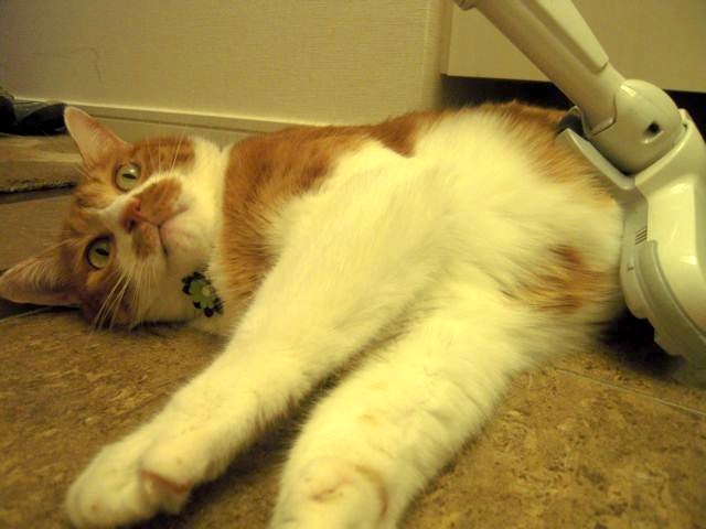 掃除機を取り出す音を聞くと、ほとんど必ず玄関に先回りして行って寝ころびます。寝ころんで催促がましくして待っています。