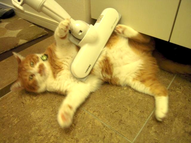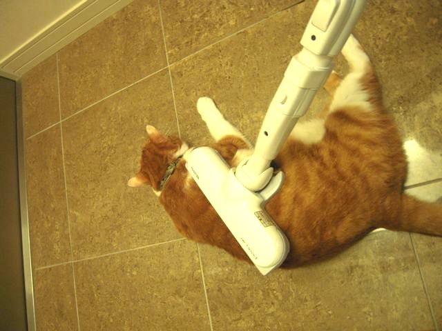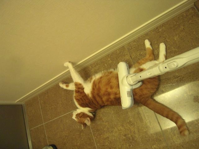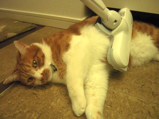 掃除機で吸うと、「こっちも。」「そしてこっちも。」と横を向いたりお腹をだしたり。